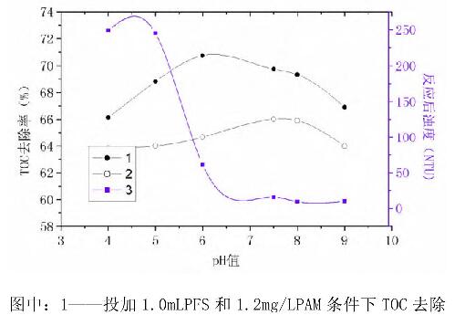 兩組實驗攪拌結束后靜置30min取上清液測TOC濃度和濁度。結果見圖3所示。率隨pH值的變化曲線;2——投加1.4mL聚合硫酸鐵條件下TOC去除率隨pH值的變化曲線;3一一投加1.OmL聚合硫酸鐵和1.2mg/LPAM條件下反應后濁度隨pH值的變化曲線。